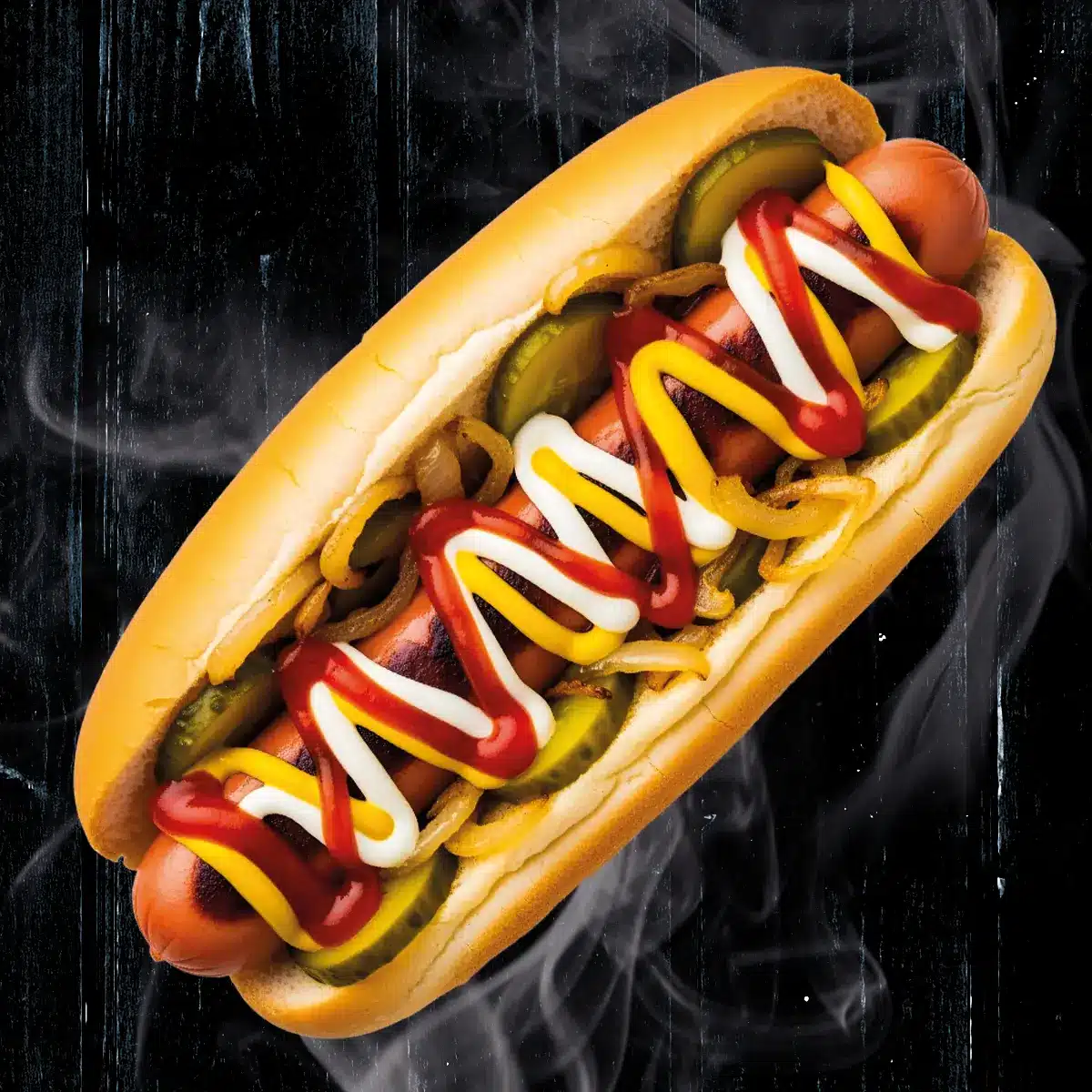 Булка для американського хот-догу, сосиска в асортименті, цибуля карамелізована, мариновані огірки, кетчуп, майонез, гірчиця.