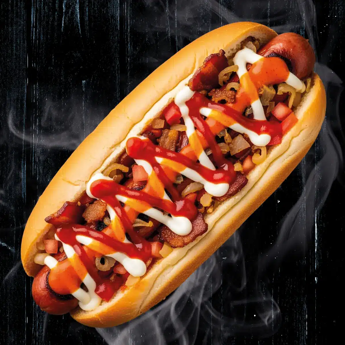 Булка для американського хот-догу, сосиска в асортименті, бекон, помідори, цибуля карамелізована, мариновані огірки, кетчуп, майонез, гострий соус.